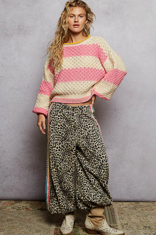 POL Contrast Striped Round Neck Sweater with Textured Cable Knit Pattern