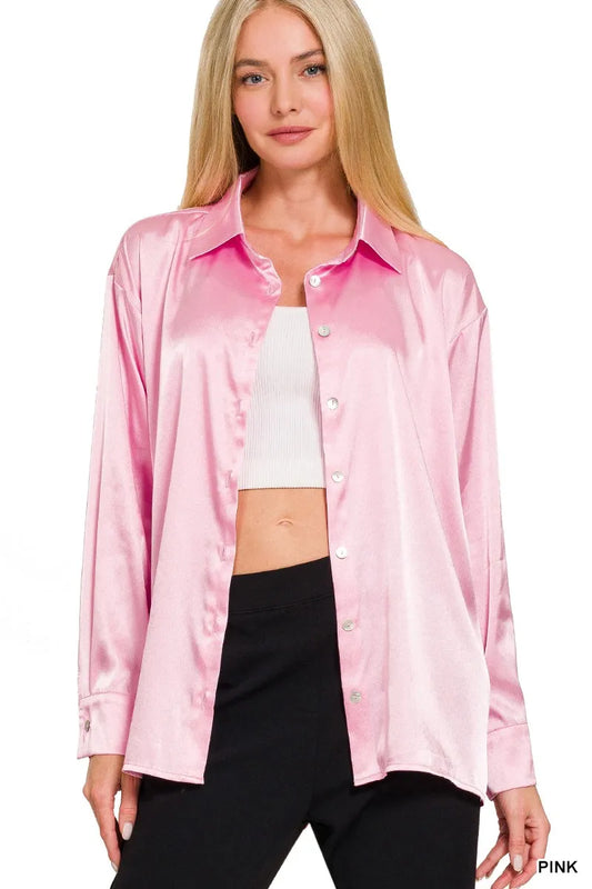 Pink Satin Button-Up Top – Luxe Charmeuse Oversized Blouse